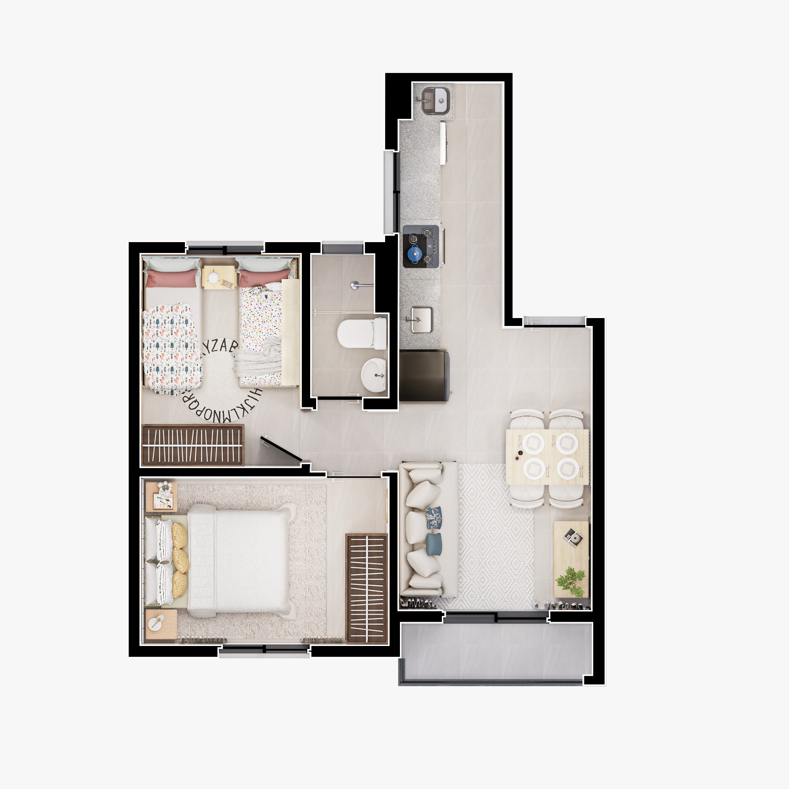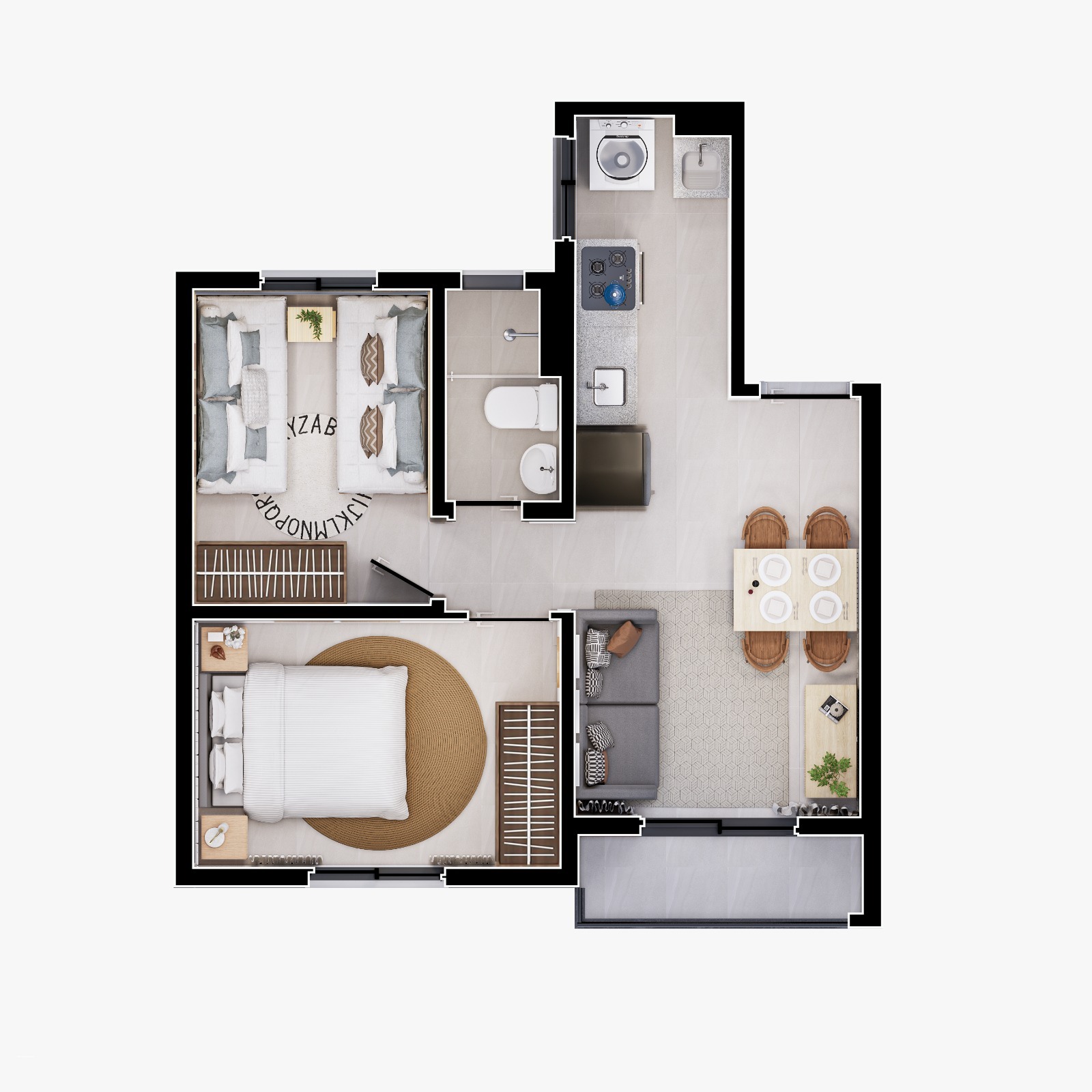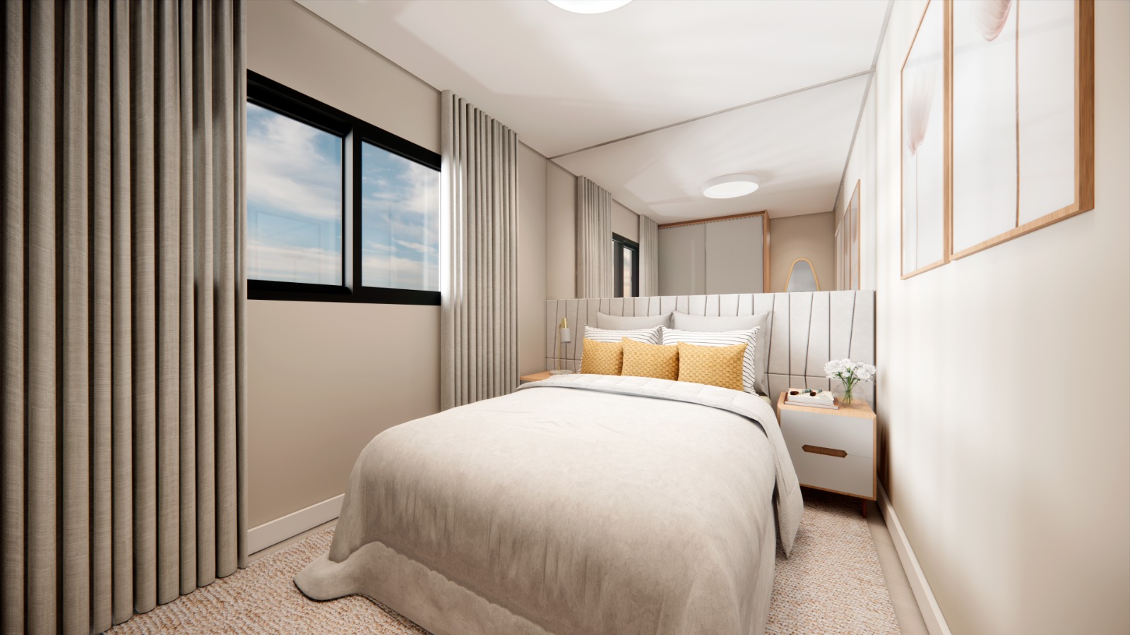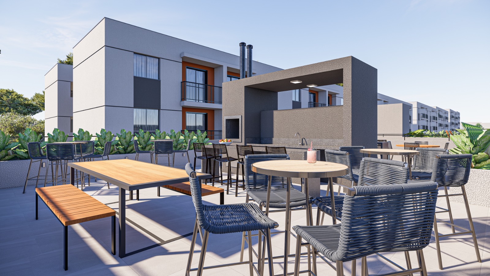 Apartamentos com 2 dormitórios, incluindo suíte e sacada com churrasqueira em todas as unidades.